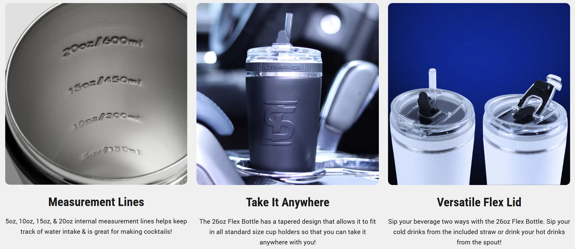 For added convenience, the tapered design of the 26oz. Flex Bottle allows for it to fit in all standard size cup holders while the silicone base prevents the cup from sliding, chipping, and makes it less noisy when setting it down. Keep your hot drinks hot and your ice-cold drinks cold with Ice Shaker's 26oz. Flex Bottle.